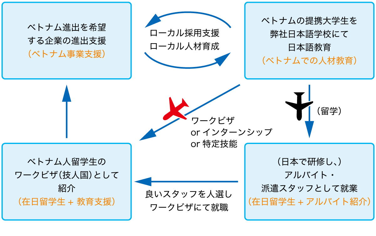 ・日本での正社員就職企業者とインターンシップ生が、ベトナム国内の教育費も含め完全無償"無料"で渡日できる仕組み